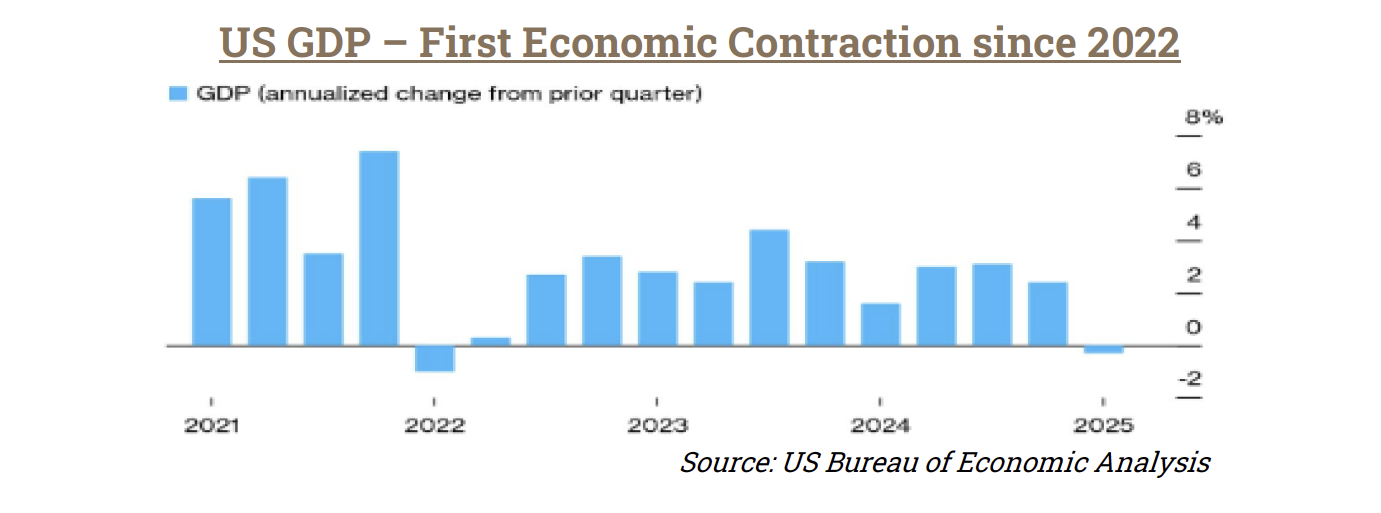 Marking his 100th day in office at a rally in Michigan on 29th April, Trump declared he had “… delivered the most profound change in Washington in 100 years” and that he had “just gotten started.” But having promised Americans a “boom like no other” if they elected him president, the 78-year-old Republican’s performance for consumers, companies, the economy and workers, is now clearly much less celebratory. For someone who feeds foremost on public adoration, the flipping of his approval rating from positive to negative since his inauguration must be leaving its mark. The majority of Americans are voicing concern about a recession and how a trade war will affect the economy/employment, the value of their savings after the S&P500 briefly entered ‘bear market’ territory earlier last month and the rising price of goods amid a tumbling US$. Driving this home the same day, Conference Board data confirmed that April’s consumer confidence had fallen to an almost five-year low, followed one day later by the Commerce Department estimating US economy (GDP) had suffered its worst quarter since Covid, contracting 0.3%in the first three months of 2025 (Q4 2024: +2.4%). While this may reflect a surge of imports from US firms seeking to front-run the tariff impositions, the fact that initially defiant trade responses were registered all around the world (particularly from the main battleground, China) and the fact that trade resolutions are likely to take much longer to negotiate than Trump wishes, means that the situation should be expected to get quite a lot worse (including an inflationary spike) before things start to stabilise.