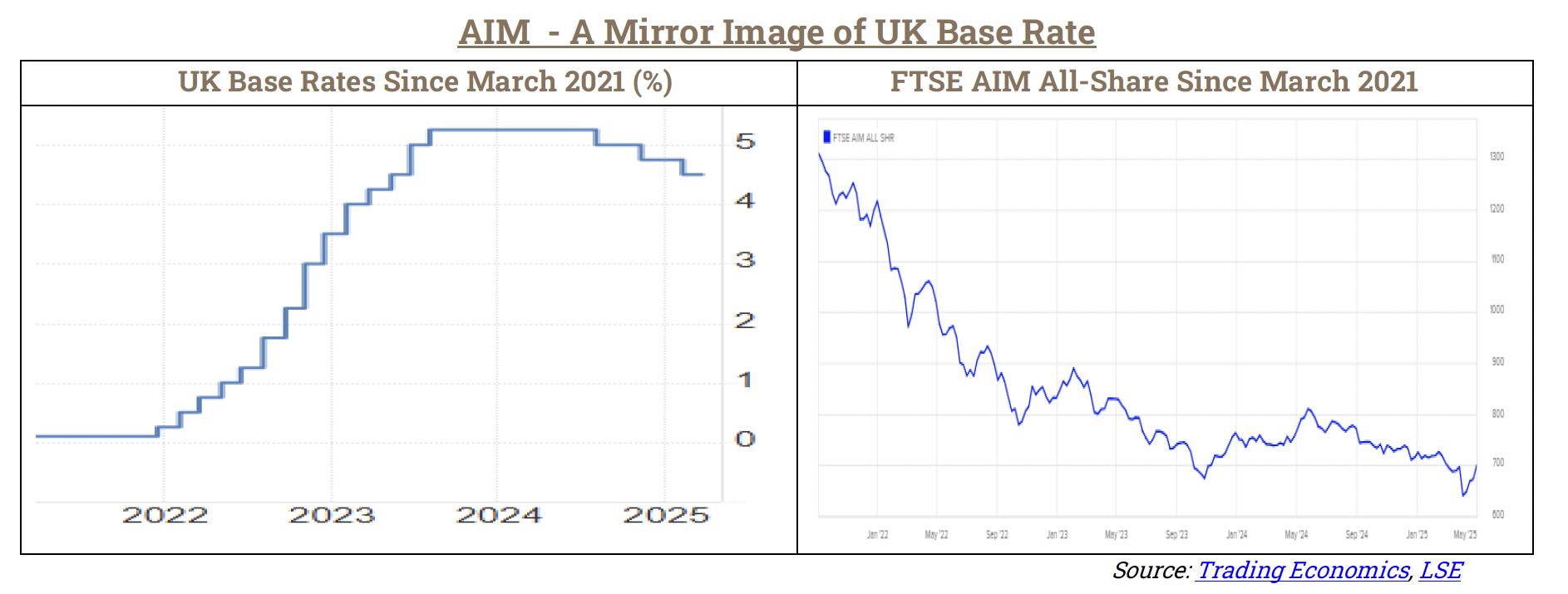 As the charts below demonstrate, the cost of capital required to fund growth amongst these young, often pre-revenue, cash-consuming enterprises is also key to their continuing prosperity. Having enjoyed more than five years of exceptionally low base rates (range 0.1% to 0.75%), the post-COVID inflationary spiral that saw UK annualised CPI spike from just 0.7% in March 2021 to a 41-year high of 11.1% by October 2022, resulted in no less than 14 base rate hikes between December 2021 and August 2023. To make things worse, the index’s dilemma was then capped in the Chancellor’s Autumn Budget 2024, with a halving of the effective inheritance tax relief on AIM shares (effective from April 2026) despite the longer-term investment support that it was known to provided. This in turn contributed to a number of its traditional investors and dedicated small/microcap funds being forced to exit, with their sell-down helping to produce a quite extraordinary valuation gap in the process.