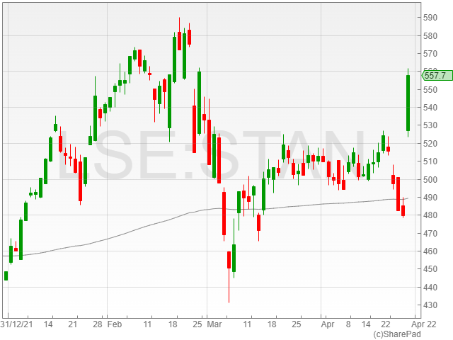Standard Chartered shares were up 16.5% to 558.9p following a 6% year-on-year increase in Q1 2022 pre-tax profits to $1.5 billion against $1.4 billion, alongside an increased guidance slightly ahead of its previous estimate of 5-7% for the year.