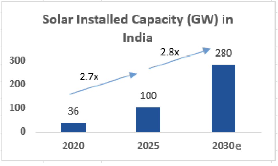 Source: Govt of India – Press Information Bureau MNRE: Year End Review, Dec 20. MNRE: Press Release: 2100603, Feb 25. Grant Thornton Report, Achieving 500 GW of renewable energy capacity by 2030, 2024. e indicates estimate.