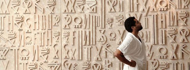 RETNA’s work includes large-scale murals and sculptures as well as smaller, more gallery-friendly pieces featuring his charismatic geometric script which is aesthetically reminiscent of Egyptian hieroglyphs and Native American symbology. His text is not written in an identifiable language, since RETNA explains that “I want my text to feel universal. I want people from different cultures to all find some similarity in it—whether they can read it or not.”