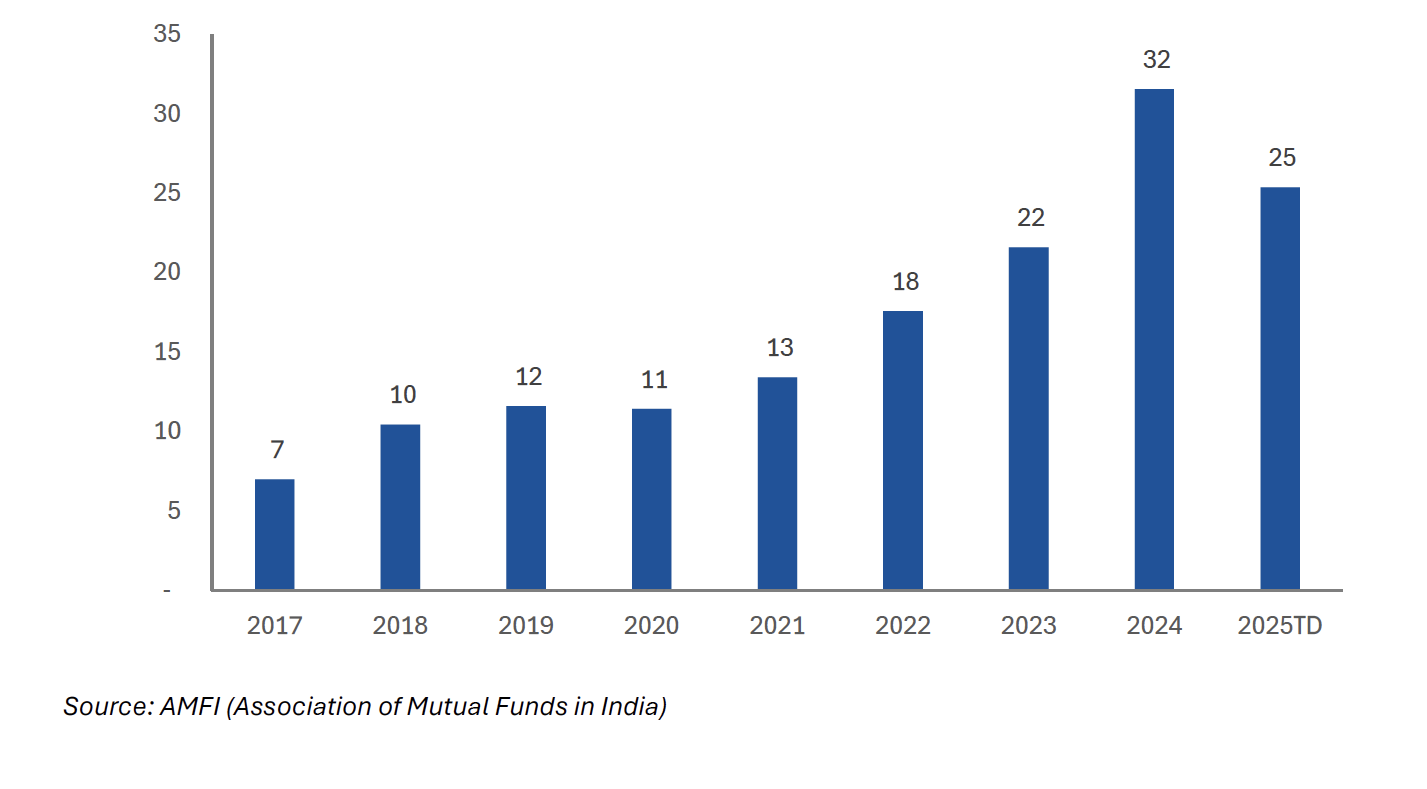 The domestic Mutual Fund industry has experienced significant expansion over last two decades, with Assets Under Management (AUM) multiplying approximately 44 times to reach US$773 billion by March 2025! In the last 5 years itself, it has grown more than 3 times. This tremendous growth stems from sustained capital inflows, currently averaging around $4 billion monthly, with gross inflows through Systematic Investment Plans (SIP) alone contributing over US$3 billion per month. SIPs represent an investment methodology by which a person can contribute fixed amounts to selected mutual fund schemes on monthly, quarterly, or annual basis, typically spanning six months to several years.